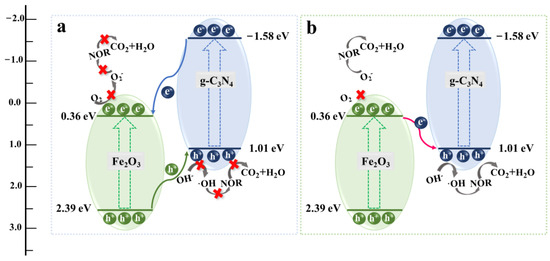 Based on the above results and discussion, two possible photocatalytic degradation mechanisms for NOR with Fe2O3/g–C3N4 composites are proposed, including type II and S-scheme heterojunctions. Under visible light illumination, photogenerated electrons (e−) on the VB of Fe2O3 and g–C3N4 are transferred to the CB, and holes (h+) are left in the VB. In addition, the VB potential of Fe2O3 is higher than that of g–C3N4 and the CB potential of Fe2O3 is higher than that of g–C3N4. According to the type II electron transfer mode in Figure 10a, electrons transfer from the CB of g–C3N4 to the CB of Fe2O3, while holes transfer from the VB of Fe2O3 to the VB of g–C3N4. The CB energy of Fe2O3 (0.36 eV) is higher than O2/•O2− (−0.33 eV) and the VB of g–C3N4 (1.01 eV) is lower than OH−/•OH (1.90 eV). Therefore, the electrons in the CB of Fe2O3 and the holes in the VB of g–C3N4 cannot react with dissolved/adsorbed O2 and H2O/OH− molecules to form •O2− and •OH, respectively. It is obvious that the traditional charge transfer mode is not consistent with the free radical trapping and ESR results, indicating that the type II electron transfer mode is not applicable in as-prepared Fe2O3/g–C3N4 composites in this study. The S-scheme electron transfer mode is proposed and shown in Figure 10b. Under irradiation, photogenerated electrons jump from the CB of Fe2O3 to the VB of g–C3N4 and rapidly combine with the holes in the VB of g–C3N4, leading to the accumulation of electrons with a higher reducing ability in the CB of g–C3N4 and to the retention of holes with a higher oxidation ability in the VB of Fe2O3. Importantly, adsorbed/dissolved O2 could be activated into •O2− by electrons with higher reducing abilities, and OH−/H2O could be oxidized to •OH by holes with higher oxidation abilities. Eventually, the reaction species of •O2−, •OH, e−(g–C3N4) and h+ (Fe2O3) could degrade NOR into CO2 and H2O in a process that can be described as follows: