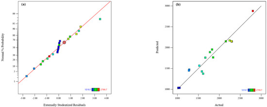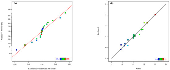The normal probability distribution of the MPOSB methylene blue adsorption residuals is plotted in Figure 1a. The data points were nearly linear, indicating that the model accurately described the relationship between the response variables and values, which indicated that it was well adapted [37]. The distributions of the predicted and actual values are shown in Figure 1b, where the actual values are plotted more densely near the prediction line, indicating a good model fit. Therefore, the prediction model could effectively predict the adsorption ability of the MPOSB.