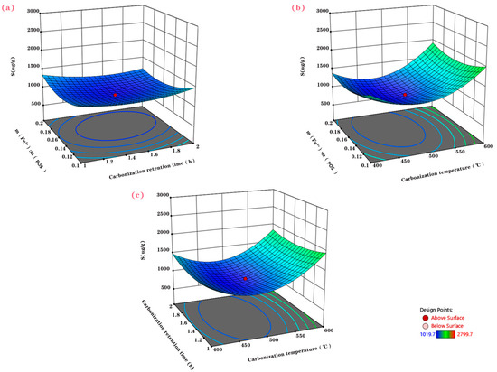 Effects on MPOSB adsorption values with different carbonization parameters. (a) Interaction between carbonization retention time and m(Fe3+):m(POS) at carbonization temperature of 500 °C. (b) Interaction between carbonization temperature and m(Fe3+):m(POS) at carbonization retention time of 1.5 h. (c) Interaction of carbonization temperature and carbonization retention time when m(Fe3+):m(POS) was 0.15.