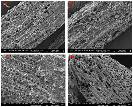 SEM images of MPOSB subjected to different carbonization processes ((a–d) samples in Table 9).