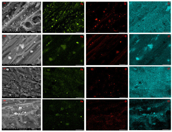 The distribution of iron on the surface of the MPOSB was further determined by using EDS spectroscopy. As shown in Figure 5 for the four carbonization process conditions, the distribution of iron, oxygen, and chlorine on the surface of the MPOSB was found to be consistent with the forms of iron present at different carbonization temperatures, chloritization at 400 °C, and transformation into metal oxides at 600 °C. It was proved that iron content was also one of the reasons for the change in the adsorption properties of the MPOSB.