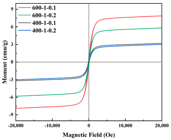 At room temperature, all four MPOSB types exhibited no hysteresis, and their coercivity and remanent magnetization were 0 (Figure 6). The curves showed saturation magnetization strengths of 7.86, 5.80, 3.18, and 3.00 emu/g, indicating that the prepared magnetic biochar was superparamagnetic and could be recycled with the application of a magnetic field [42]. The curves showed that the MPOSB with m(Fe3+):m(POS) = 0.1 had greater magnetization intensity than that of MPOSB with m(Fe3+):m(POS) = 0.2. This verified the correct optimization of the m(Fe3+):m(POS) process parameter in the model.