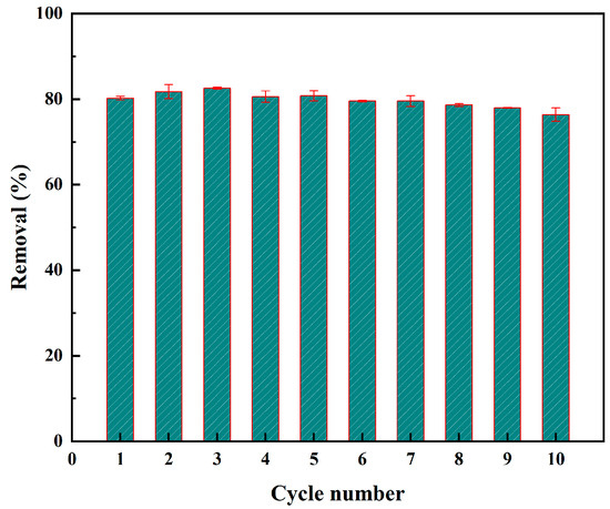After the adsorption process was complete, the biochar was immobilized on the side of the reaction vessel using a strong magnet. Following magnetic separation, the obtained biochar was washed multiple times with deionized water and anhydrous ethanol. The collected adsorbent was then dried in a vacuum oven at 60 °C for 2 h and used for subsequent adsorption–desorption experiments. To evaluate the stability and reusability of the biochar, 10 regeneration cycles were conducted.