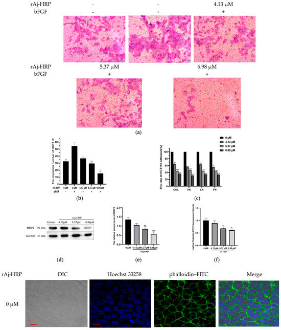 Matrix metalloproteinase 2 (MMP2), a member of the MMP family, can cleave ECM components. MMP2 expression is closely associated with tumor cell migration and prognosis [20,21,22,23]. The effect of rAj-HRP on MMP2 expression in HCT116 cells was evaluated. As shown in Figure 3d,e, MMP2’s relative expression decreased with increasing concentrations of rAj-HRP, indicating that rAj-HRP downregulates MMP2 expression, thereby inhibiting HCT116 cell migration.