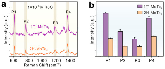 In order to characterize the Raman enhancement effect on MoTe2 films, R6G was chosen as the probe molecule and the excitation wavelength was 532 nm. In Figure 3a, the main Raman characteristic peaks for R6G (1 × 10−5 M) molecules adsorbed on MoTe2 can be observed at 612 (P1, C-C-C ring in-plane bend), 773 (P2, C-H out-of-plane bend), 1185 (P3, C-C stretching vibration bend), and 1363 cm−1 (P4, aromatic C-C stretching), respectively [33]. By monitoring the Raman peak at 612 cm−1, the Raman intensity of R6G molecules on 1T′-MoTe2 was shown to be ~2.4 times stronger than on 2H-MoTe2 (Figure 3b). These results indicate that 1T′-MoTe2 films have higher SERS sensitivity than 2H-MoTe2 films.