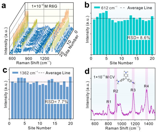 The relative standard deviations (RSDs) were calculated by randomly selecting 20 points on 1T′-MoTe2 films (Figure 5a). The RSD values of characteristic Raman peaks at 612 and 1360 cm−1 were 8.6% and 7.7% (Figure 5b,c), respectively, indicating the good signal uniformity. In addition, CV is a prohibited fish drug, which can be detected by using 1T′-MoTe2 as a SERS substrate. As shown in Figure 5d, four characteristic Raman peaks of CV at 808 (R1, ring C-H bend), 915 (R2, ring skeletal vibration of radical orientation), 1178 (R3, ring C-H bend), and 1372 cm−1 (R4, N–phenyl stretching) could be observed [40], indicating that MoTe2 has a promising application in food safety.
