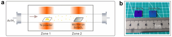 (a) Schematic illustration of the synthesis of MoTe2 films using the CVD method. (b) The optical images of as-prepared MoTe2 films.