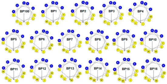 The α-helical wheel projections for BP100 and its analogs were generated using HeliQuest online tool (https://heliquest.ipmc.cnrs.fr, accessed on 17 September 2023). As illustrated in Figure 1, BP100 displays a distinct amphipathic character, with hydrophilic amino acid residues situated on one face and hydrophobic residues aligned on the opposite face. To maintain the +5 positive net charge, we retained the five original Lys residues on the hydrophilic face of BP100. We then synthesized a series of Trp-substituted BP100 analogs, systematically replacing hydrophobic residues on the hydrophobic face with one, two, or three Trp residues.