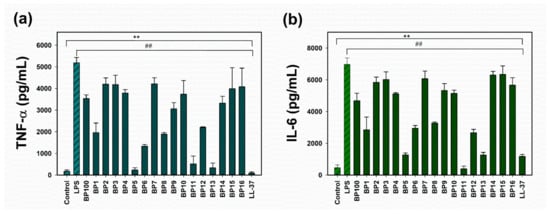 Prior to assessing anti-inflammatory activity, the biocompatibility of BP100 and its analogs was evaluated on untreated RAW 264.7 cells using an MTT assay. The results demonstrated that BP100 and its analogs were non-toxic to RAW 264.7 cells at concentrations up to 4 μM (Figure S2). Notably, at a non-toxic concentration of 2 μM, several BP100 analogs (BP1, BP5, BP6, BP8, BP11, BP12, and BP13) more effectively suppressed the release of TNF-α and IL-6 in LPS-stimulated RAW 264.7 cells compared to BP100 (Figure 2). These findings suggest that BP100 and the aforementioned analogs (BP1, BP5, BP6, BP8, BP11, BP12, and BP13) are potent anti-inflammatory agents, exhibiting effectiveness comparable to that of the control anti-inflammatory peptide, LL-37 [19].