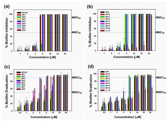 Antibiofilm activity of BP100 and its analogs against multidrug-resistant Pseudomonas aeruginosa (MDRPA). (a,b) Inhibitory activity against biofilm formation. (c,d) Eradication activity of preformed MDRPA biofilms. Dotted lines indicate 50% inhibition (MBIC50), 90% inhibition (MBIC90), 50% eradication (MBEC50), and 90% eradication (MBEC90) concentrations. Values represent the mean ± standard error of the mean (SEM) from three independent experiments.