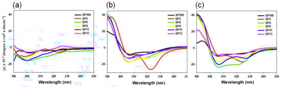 The secondary structures of BP100 and the five selected analogs were investigated in PBS and in membrane-mimicking solvents (50% TFE in PBS and 30 mM of SDS in PBS) using CD spectroscopy (Figure 4). All peptides adopted a mostly random-coil structure in PBS, as demonstrated by the broad minimum peak at 200 nm. In a negative electric environment (30 mM of SDS) and a hydrophobic environment (50% TFE), except BP5, all peptides formed a stable α-helical conformation with two minimum signals around 208 nm and 222 nm and a maximum signal at 192 nm.