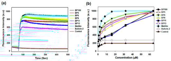 The outer membrane (OM), characterized by the presence of lipopolysaccharides (LPS), distinguishes Gram-negative bacteria and serves as a formidable barrier against various antimicrobial agents. We utilized Escherichia coli (KCTC 1682) as a representative model to investigate how BP100 and its selected analogs influence OM permeability. Changes in permeability were measured using the N-phenyl-1-naphthylamine (NPN) assay, which quantifies fluorescence intensity [27,30]. Under normal conditions, the integrity of the OM prevents NPN from entering the cell. However, if the membrane integrity is compromised, NPN shifts to the cell’s hydrophobic environment, triggering an increase in fluorescence emission. Similar to melittin, we observed a correlation between the concentration of BP100 and its selected analogs and the uptake of NPN; notably, a significant uptake of approximately 100% occurred at a peptide concentration of 32 μM (Figure 5b). These findings indicate that BP100 and its selected analogs can perturb the OM of E. coli in a dose-dependent manner, suggesting a cumulative effect on membrane disruption.