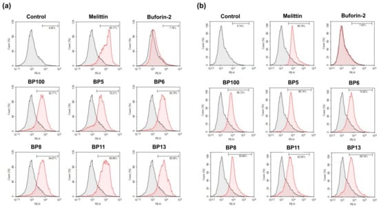 The permeabilization of the bacterial inner membrane (IM) by BP100 and its analogs was evaluated using propidium iodide (PI). PI, a membrane-impermeant red fluorescent dye that binds to nucleic acids, causes a marked increase in fluorescence intensity by as much as 20–30 times when bound to DNA, compared to its presence in aqueous solutions [27,31]. The peptide-induced disruption of the IM allows PI to enter the cells and bind to DNA, resulting in the bacteria emitting red fluorescence. As shown in Figure 6, unlike buforin-2, BP100 and its selected analogs, similar to melittin, caused substantial cell membrane damage. This is evident in the elevated percentages of PI-positive E. coli (KCTC 1682) (ranging from 78.21% to 89.96%) and S. aureus (KCTC 1621) (ranging from 62.93% to 93.68%). These findings confirm that BP100 and its selected analogs exert their antibacterial effects by depolarizing, disrupting, and permeabilizing bacterial cell membranes.