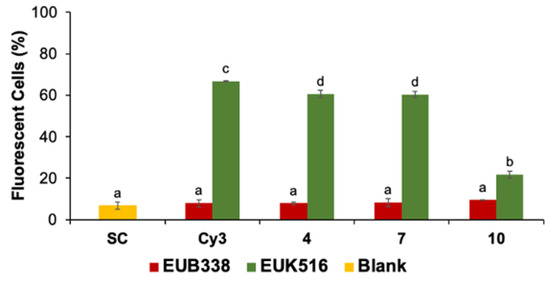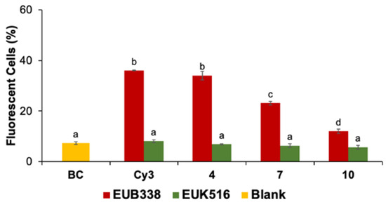 The percentage of fluorescent Bacillus sp. cells labeled with EUB338 and EUK516 probes, each with different markers (4, 7, 10, and Cy3), along with their respective controls, is shown. In each assay, 1000 cells were analyzed in triplicate. The values presented represent the average flow cytometry measurements, with error bars indicating the standard deviation (±SD). In each plot, distinct letters above the error bars denote significant differences (p < 0.05).