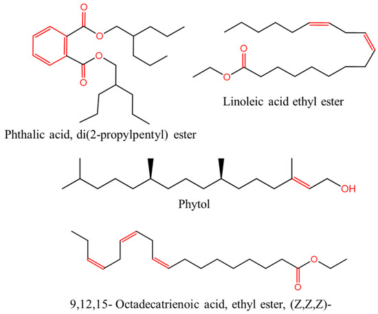 where qk(N), qk(N+1) and qk(N−1) are the charge values of k atom for neutral, anionic, and cationic forms of the molecule, respectively. The higher the value of fk+ or fk−, the greater the nucleophilic (ability to accept electrons) or electrophilic character (ability to donate electrons) of the atom, respectively. Figure 11 illustrates the most reactive atoms in the main phytochemical compounds in the PSL extract, and the Fukui function values are listed in Table S2. As shown in Figure 11a, the double bond (C17 and C18 atoms) is the main site involved in electrophilic and nucleophilic interactions for phytol. In the case of the steroid compound (Figure 11b), the atoms in the carbonyl group (C11, O12) and double bonds (C2, C1, and C20, C19) were estimated as the most active center for nucleophilic attack, whereas the O12, O13, H39, H40, and H51 atoms presented the most electrophilic character. For the phthalic ester compound (Figure 11c), the most reactive atoms are distributed in the aromatic ring (C9, C11, C6, C8) and the esters group (C4, O5, C12). Finally, in linoleic acid ethyl ester (Figure 11d), the most susceptible atoms to nucleophilic attack were O19 and C18 from the carbonyl group, and for electrophilic interactions, they were the C9, C10, and C6 from the double bonds.