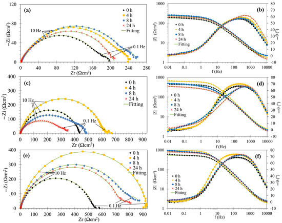 Figure 5 and Figure 6 show the EIS spectra for mild steel in the acidic solution at different immersion times without and with several concentrations of the PSL extract. In the absence of the corrosion inhibitor, the Nyquist curves (Figure 5a) showed apparently two depressed capacitive loops: the capacitive loop at high and intermediate frequencies was attributed to the charge transfer process in parallel with the effect of the electrochemical double-layer capacitance, and the smaller capacitive loop at lower frequencies can be associated with the adsorption of intermediate species during the anodic dissolution of Fe in acid solution in the presence of Cl− ions [43,44]. In the inhibited system, the Nyquist curves (Figure 5a,c,e) also exhibited two semicircles with higher diameter in comparison to the blank solution, except at 0 h (for all concentrations) and 4 h (only at 100 ppm) of exposure, where a less depressed semicircle was apparently observed.