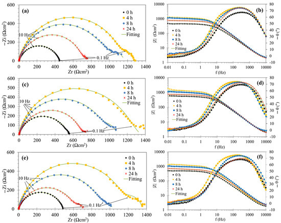 To extract quantitative information from EIS spectra, several electrical equivalent circuits (EECs) were tested to fit the EIS data and model the metal–solution interface in the absence and presence of corrosion inhibitor film. The proposed EEC (Figure 7) is the electrical representation for the active dissolution mechanism of iron in acidic solutions containing chloride ions, which considers the adsorption of intermediate species [43,44]. With the addition of the PSL extract, competitive adsorption between these intermediate species and the phytochemical molecules can occur on the metal surface, surprising the anodic dissolution and hydrogen evolution reactions, as discussed in a later section. The simple Randles circuit was used to fit the EIS data of the inhibited system at 0 h of exposure. The fitted EIS spectra acquired with the ZSimpWin v. 3.22 software are shown in Figure 5 and Figure 6. Figure S1 shows examples of suitable fitting experimental EIS data using this software.