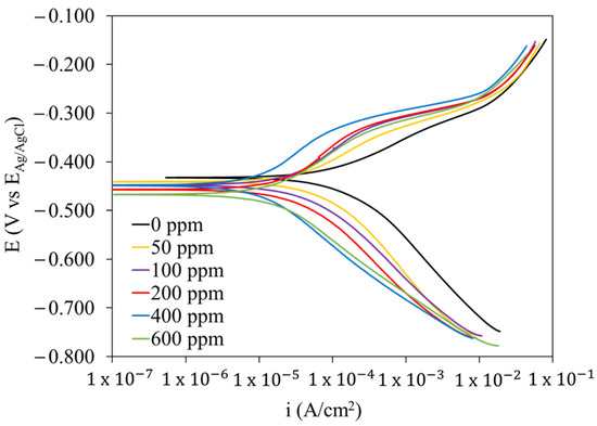 Polarization curves of mild steel in the acid solution at different concentrations of the PSL extract at 4 h of exposure time are shown in Figure 8, and their electrochemical parameters arising from the Tafel extrapolation method are summarized in Table 3, including the corrosion potential (Ecorr), anodic and cathodic Tafel slopes (ba y bc), and the corrosion current density (icorr). As shown in Figure 8, the presence of PSL extract shifted the anodic and cathodic branches towards lower current density values, slightly modifying the anodic and cathodic slopes. As shown in Table 3, the general trend of the Tafel slope values was that the ba values increased and the bc values decreased as more PSL extract was added. Moreover, the Ecorr value shifted up to 32 mV in the cathodic direction. Based on the criterion of the Ecorr shift of 85 mV to classify a chemical compound in a corrosion inhibitor type, as well as the effect of the addition of the corrosion inhibitor in the Tafel slopes, these results suggest that the phytochemical compounds in the PSL extract acted as mixed-type corrosion inhibitors, suppressing both the anodic and cathodic reactions and with a predominant effect on the cathodic reactions [47,48].
