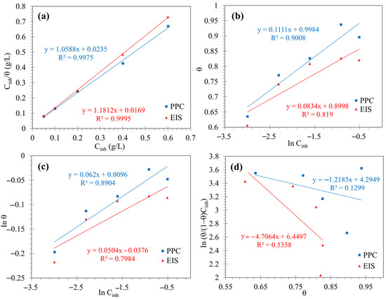 Adsorption isotherms plotted from electrochemical measurements: (a) Langmuir, (b) Temkin, (c) Freundlich, and (d) Frumkin.