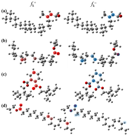 Most reactive atoms of the main compounds of the PSL extract based on the condensed Fukui functions: (a) phytol, (b) 9,12,15-Octadecatrienoic acid, ethyl ester, (Z,Z,Z)-, (c) phthalic acid, di(2-propylpentyl) ester, (d) linoleic acid ethyl ester.