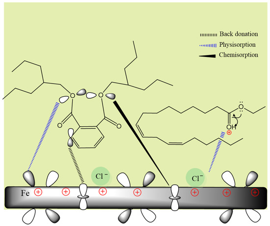 It is worth noting that the dissolution of Fe can occur simultaneously without the participation of the Cl− ion via the adsorbed intermediate [FeOH]ads [59]. In the presence of the PSL extract, there is a competitive adsorption between the intermediate complexes from electrochemical reactions and the phytochemical compounds. Figure 12 schematizes some of the physical and chemical interactions of adsorption of some phytochemical compounds of the PSL extract on the metal surface. By determining the zero-charge potential, it has been confirmed that the metal surface is positively charged [60]. This causes the adsorption of chloride ions to the metal by electrostatic attraction, which, in turn, produces electrostatic interactions (physisorption) with the partially positively charged sites of the inhibitor molecules because some of the phytomolecules present in the PSL extract can become protonated in the nucleophilic sites in acid solution. The O atom of the carbonyl group can be protonated and in equilibrium with its neutral form because the adsorbed protonated molecules can compete with H+ ions for electrons on the metal surface. This results in the release of H2 gas and the return of the carbonyl group to its neutral form [61].