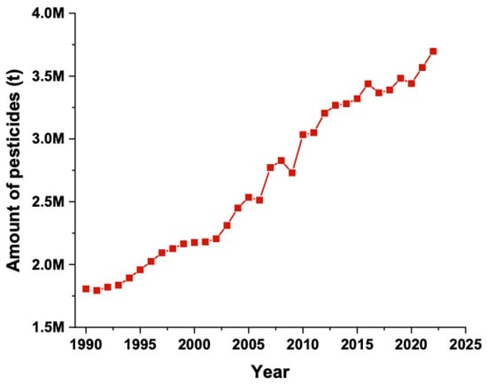 Fewer than 0.1% of pesticides reach target organisms, such as insects, weeds, and fungi, while the remainder enters surrounding ecosystems, where they can persist for many years [7]. Over recent decades, global usage of these chemicals has increased twofold (Figure 1), contributing to their presence in aquatic environments primarily through direct runoff, leaching, transport processes, improper disposal of empty containers, and equipment washing [8,9]. According to Maximize Market Research, the global pesticide market was valued at US$36.4 billion (bn) in 2023, with Brazil (US$3.75 bn), France (US$2.01 bn), and the United States (US$1.58 bn) as the top importers, and China (US$5.25 bn), France (US$4 bn), and India (US$2.63 bn) as the top exporters [10].