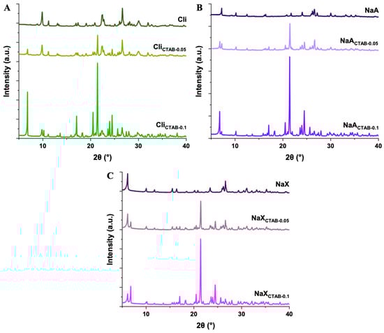 XRD patterns of Cli (A), NaA (B), NaX (C), pure and modified with CTAB, in the angle range 2θ = 5–40°.