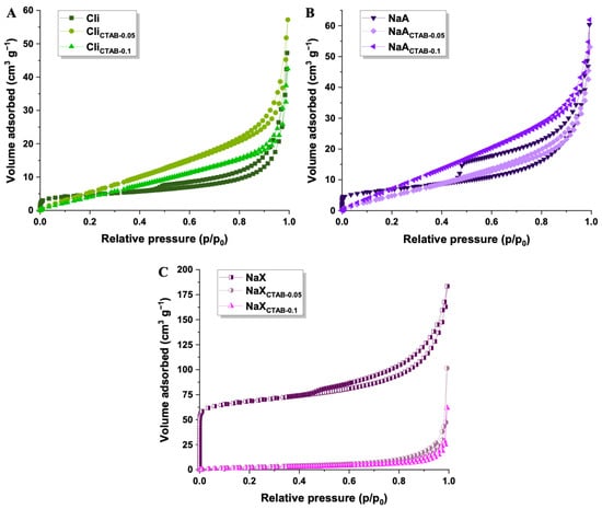 Nitrogen adsorption/desorption isotherms of Cli, CliCTAB-0.05, CliCTAB-0.1 (A), NaA, NaACTAB-0.05, NaACTAB-0.1 (B), and NaX, NaXCTAB-0.05, NaXCTAB-0.1 (C).