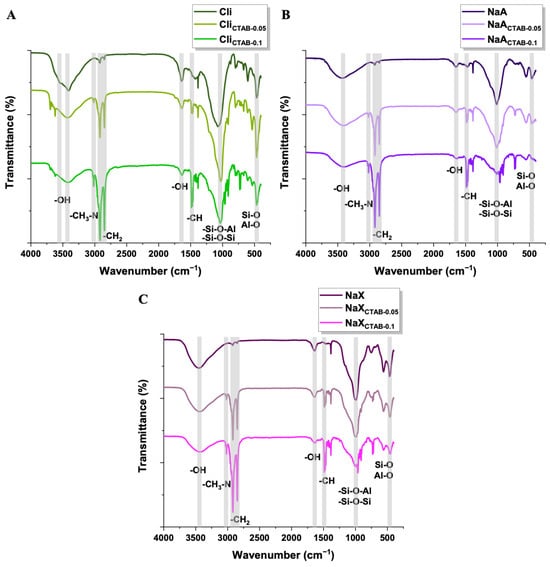 Characteristic reflections for all zeolites were identified with X-ray diffraction (XRD) (Figure 2). For Cli the reflections were found, among others, at 2θ ≈ 9.88°, 11.21°, 22.49°, 30.07°, 32.01° (dhkl = 8.94, 7.89, 3.95, 2.97, 2.79 Å). Reflections attributed to quartz, which is considered an impurity, were also visible at 2θ ≈ 20.88°, 26.65°, 36.57°, 39.50° (dhkl = 4.25, 3.34, 2.45, 2.28 Å) [52]. In the case of NaA and NaX, reflections from the zeolite phase were present at 2θ ≈ 7.20°, 10.21°, 24.05°, 27.18°, 30.01° (dhkl = 12.26, 8.65, 3.70, 3.28, 2.97 Å) and 2θ ≈ 6.14°, 10.04°, 15.51°, 26.63°, 31.08° (dhkl = 14.38, 8.80, 5.71, 3.34, 2.87 Å), respectively. Admixtures of mullite or quartz and a higher background level were also observed as the fly ash was not completely converted into zeolite [47,50]. The XRD results of studied zeolites are consistent with the diffractograms of commercially available ones, which proves that they can be successfully synthesized with the use of waste materials. No notable shifts in the position of intense reflections for Cli, NaA, or NaX were detected after modifications, which indicates that CTAB did not alter the structure of materials. New reflections from CTAB, e.g., at 2θ ≈ 6.81°, 21.46°, 24.51°; dhkl = 12.96, 4.14, 3.63 Å (CliCTAB-0.05), 2θ ≈ 6.81°, 10.22°, 21.44°, 24.49°; dhkl = 12.96, 8.65, 4.14, 3.63 Å (CliCTAB-0.1), 2θ ≈ 6.83°, 21.48°, 24.52°; dhkl = 12.93, 4.13, 3.63 Å (NaACTAB-0.05), 2θ ≈ 6.79°, 21.43°, 24.48°; dhkl = 13.00, 4.14, 3.63 Å (NaACTAB-0.1), 2θ ≈ 6.80°, 21.45°, 24.51°; dhkl = 12.98, 4.14, 3.63 Å (NaXCTAB-0.05), and 2θ ≈ 6.79°, 21.43°, 24.48°; dhkl = 13.00, 4.14, 3.63 Å (NaXCTAB-0.1) could be seen as well. In the case of the CliCTAB-0.1 sample, the observed splitting of the reflection corresponding to the zeolite phase at 9.88° was the result of a new reflection at 10.22° due to modification with CTAB. The intensity of these reflections was higher for a CTAB concentration of 0.1 mol L−1 [53,54].