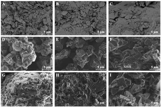 SEM images of Cli (A), CliCTAB-0.05 (B), CliCTAB-0.1 (C), NaA (D), NaACTAB-0.05 (E), NaACTAB-0.1 (F), NaX (G), NaXCTAB-0.05 (H), NaXCTAB-0.1 (I).