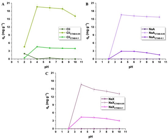 Effect of pH (2–10) on the removal of pesticide with the use of pure and CTAB-modified Cli (A), NaA (B), and NaX (C) (2,4-D concentration: 25 mg L−1, adsorbent mass: 50 mg).