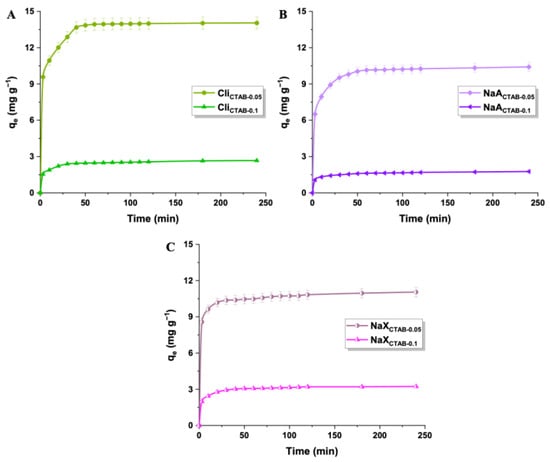 Impact of contact time (0–240 min) on the adsorption of 2,4-D onto Cli (A), NaA (B), and NaX (C) modified with CTAB (2,4-D concentration: 15 mg L−1, adsorbent mass: 50 mg).