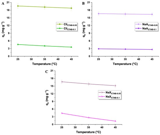 Temperature influence (RT, 35, 45 °C) on 2,4-D uptake on CliCTAB-0.05, CliCTAB-0.1 (A), NaACTAB-0.05, NaACTAB-0.1 (B), and NaXCTAB-0.05, NaXCTAB-0.1 (C) (2,4-D concentration: 25 mg L−1, adsorbent mass: 50 mg).