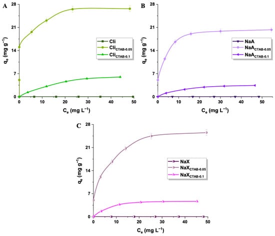Table 2 summarizes the textural parameters of all samples. NaX has a higher specific surface area (260 m2 g−1) as well as pore volume (0.19 cm3 g−1) than Cli (17 m2 g−1, 0.03 cm3 g−1) and NaA (23 cm3 g−1, 0.05 cm3 g−1). In addition to mesopores, NaX possesses micropores whose area and volume are 191 m2 g−1, 0.08 cm3 g−1. After modification with CTAB, the specific surface area and pore volume decreased in the case of NaX as a result of surfactant molecules present on the surface and within the pores of materials [45]. The t-plot analysis revealed that CTAB molecules blocked micropores and contributed to the larger average pore diameter of NaXCTAB-0.05 and NaXCTAB-0.1 [63]. For Cli and NaA, the higher specific surface area was observed after modification. The surfactant molecules can create a more uniform surface coverage, which leads to the dispersion of zeolite particles, preventing aggregation and, consequently, increasing specific surface area [64,65,66].