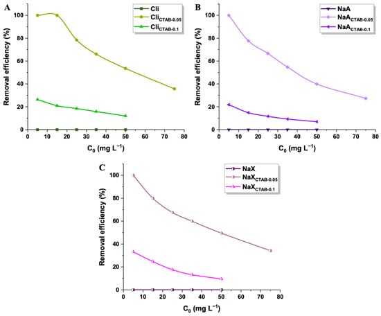 Removal efficiencies of Cli, CliCTAB-0.05, CliCTAB-0.1 (A), NaA, NaACTAB-0.05, NaACTAB-0.1 (B), NaX, NaXCTAB-0.05, and NaXCTAB-0.1 (C).