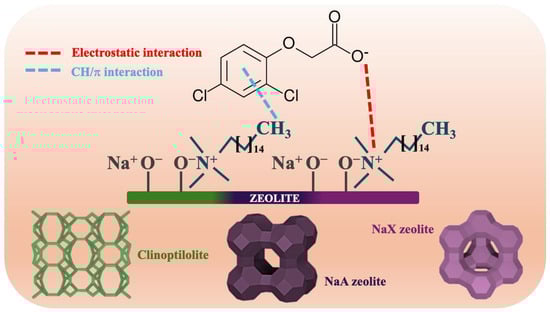 Among the various adsorbents applied in the removal of pesticides, zeolites (e.g., clinoptilolite, NaA, NaX) are highly regarded for their biocompatibility, nontoxicity, low cost, high cation-exchange capacity, internal pores, and versatile surface modification options [34,35]. The structure of clinoptilolite (with an HEU-type framework) is characterized by a sheetlike organization into layers perpendicular to the b axis. The 2D channel system consists of ten- and eight-membered tetrahedral rings—the larger A and smaller B channels run parallel to the c axis intersecting the C channel along the a axis. These channels contain exchangeable cations (e.g., Na+, K+, Ca2+) coordinated by water molecules. Four extra-framework cation positions (M(1)–M(4)) are identified, with specific positions for sodium, potassium, calcium, and magnesium ions based on their coordination environment [36]. NaA zeolite (Linde Type A) has a cubic structure with sodalite cages (principal building units) connected by four-membered rings which form a 3D pore network. The central cavities (diameter 11.4 Å) of the cages are interconnected by eight-ring openings (diameter 4.1 Å) creating an open framework [37,38]. The Faujasite framework of NaX consists of 24 tetrahedra cuboctahedral units, known as sodalite cages, which are arranged similarly to carbon atoms in a diamond structure. They are linked through hexagonal prisms (double six-membered rings), generating a 3D porous channel. This structure exhibits 12-membered oxygen ring windows of 8 Å diameter and supercages of 12 Å diameter [39]. Many studies have explored the role of zeolites in treating water for pesticide contamination. Some of them highlight the importance of employing naturally occurring zeolites or those derived from waste materials. For instance, Doan et al. [40] utilized rice husk to solvothermally synthesize bio-zeolite, which was subsequently modified with 10 mM hexadecyltrimethylammonium bromide (CTAB). The material was applied in the elimination of glyphosate and showed a high adsorption capacity of 324 mg g−1. Alvarez-García et al. [41] presented research regarding the adsorption effectiveness of methamidophos on clinoptilolite treated with NaCl solution and modified with CTAB at various concentrations. The best result (1.13 mg g−1) was obtained with the use of 25 mmol L−1 CTAB. Haghjoo et al. [42] reported the synthesis of fly ash-based NaA zeolite functionalized with cationic surfactant CTAB, which exhibited excellent adsorption capacity and glyphosate removal efficiency of 769.23 mg g−1 and 98.92%, respectively. Phouthavong et al. [43] established that non-magnetic zeolite beta and magnetic zeolite beta/Fe3O4 composite from rice husk ash-SiO2 could effectively adsorb paraquat, with respective uptakes of 70 mg g−1 and 50 mg g−1. Recent research has targeted the removal of 2,4-D using surfactant-modified zeolites. Straioto et al. [44] found that natural zeolite clinoptilolite modified with CTAB adsorbed 2,4-D with a capacity of 8 mg g−1, influenced by solution pH, temperature, length of process, and initial 2,4-D concentration. Andrunik et al. [45] described the synthesis of fly ash-based zeolites of A and X type and their composites with carbon, followed by their modification with cationic (CTAB) and nonionic (Triton X-100) surfactants. The uptake of 2,4-D for all materials was in the range of ~0.2–1.4 mg g−1. A further study by Andrunik et al. [46] focused on CTAB- and Trixton X-100-modified zeolite X and X-C composites and involved estimating the impact of pH, contact time, and initial 2,4-D concentration, yielding sorption capacities from ~0.3 to ~1.8 mg g−1.