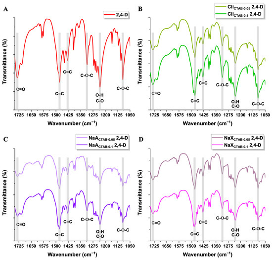 FT-IR spectra of 2,4-D (A) and CliCTAB-0.05, CliCTAB-0.1 (B), NaACTAB-0.05, NaACTAB-0.1 (C), NaXCTAB-0.05, NaXCTAB-0.1 (D) after 2,4-D adsorption.