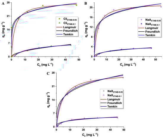 Fitting the obtained data into non-linear Langmuir, Freundlich, and Temkin models showed that 2,4-D adsorption on each material, with the exception of CliCTAB-0.05, was better described by the first model, as the values of R2 were higher (Figure 13, Table 7). This implies that adsorption occurs in a single layer on evenly spread active sites on the adsorbent’s surface. The calculated maximum adsorption capacities (qmax) closely matched the experimental values (qe(exp)) [106]. The materials modified with 0.05 mol L−1 CTAB exhibited higher KL values (0.216–0.407 L mg−1) in comparison with 0.1 mol L−1 CTAB (0.048–0.154 L mg−1), which denotes their stronger affinity to 2,4-D. The 1/n values computed from the Freundlich model ranged from 0 to 1, suggesting that the adsorption process for the pesticide was energetically favorable [109]. The bT Temkin constant related to the heat of adsorption was in the range of 0.480–2.541 kJ mol−1. This indicates that the adsorption of 2,4-D occurred through physisorption, which is associated with low adsorption energies. The KT constant corresponding to the maximum binding energy was higher for 0.05 mol L−1 CTAB-modified materials (3.52–71.16 L g−1) than for 0.1 mol L−1 CTAB-modified zeolites (0.50–1.49 L g−1) [110,111].