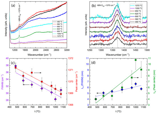 (a) Raman spectra of the h-BN films grown at different substrate temperatures and 60 min deposition time. (b) Raman spectra of the main peak with removed background and deconvoluted curves. (c) FWHM and peak center position dependence on deposition temperature. Crystallite sizes calculated using FWHM and central peak position shifting (d).