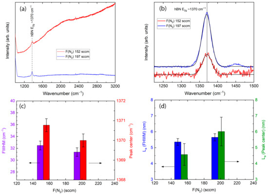 Figure 3a shows the original Raman spectra of the deposited h-BN films, grown using different nitrogen gas flows at a constant 820 °C deposition temperature and deposition time of 60 min. We see the main peak of hBN, attributed to ~1370 cm−1 of wavenumber. A luminescence hump is clearly visible in the spectra of the sample deposited with 152 sccm of nitrogen gas flow. Increasing flow to 197 sccm gives the disappearance of the luminescence hump and background. Figure 3b shows the high resolution of main peaks with removed background and deconvoluted curves. An increase in intensity with increasing nitrogen gas flow is observed. Fitted values of FWHM and the peak’s central position are presented in Figure 3c, which shows that FWHM decreases from 32.50 ± 0.96 to 31.40 ± 0.96 cm−1 with increasing gas flow. The h-BN peak position is slightly downshifting. Figure 3d shows calculated crystal sizes. With increasing nitrogen gas flow, the crystallite size calculated using FWHM values increases from 5.36 ± 0.46 to 5.65 ± 0.46 nm. The crystallite sizes estimated using h-BN peak position raised from 4.57 ± 0.93 to 6.02 ± 0.93 nm. As was described above, the different crystallite sizes calculated using FWHM and peak position can be explained by the strain effect appearing in crystallites.