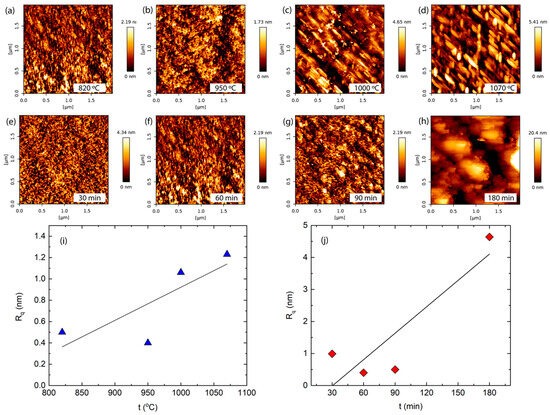 AFM images of samples deposited at (a) 820 °C, (b) 950 °C, (c) 1000 °C, and (d) 1070 °C temperatures and at a constant deposition time of 60 min. AFM images of samples deposited at (e) 30 min, (f) 60 min, (g) 90 min, and (h) 180 min times and at a constant deposition temperature of 820 °C. The surface roughness dependence on deposition temperature and time (i,j).