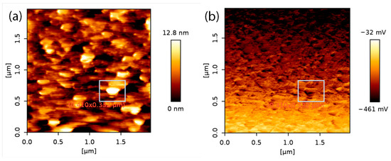In Figure 5, AFM (a) and lateral force microscopy (LFM) (b) images of the sample deposited at 820 °C temperature, 60 min growth time, and 197 sccm nitrogen gas flow are shown. We see structural elements of 10–15 nm height, 180–200 nm width, and 200–240 nm length. Comparing the image of a sample deposited at the same conditions (Figure 4a) but with a different gas flow (152 sccm), we see that an increase in nitrogen gas flow strongly influences the grain size. The image is similar to Figure 4h; only lateral force microscopy shows (at the right) that the surface has visible hexagonal structures (marked areas). That is typical of a pure boron nitride surface [20].