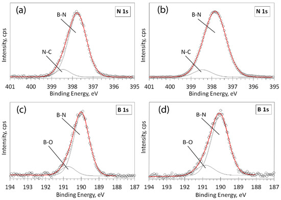Deconvolution of high-resolution XPS spectra in the N 1s and B 1s regions: for the sample T820D60, deposited at 820 °C temperature, 60 min time, and 152 sccm nitrogen gas flow (a,c); for the sample T820D60N, deposited at 820 °C temperature, 60 min time, and 197 sccm nitrogen gas flow (b,d). Circles—acquired spectra; red line—envelope; thin black lines—fitted peaks.