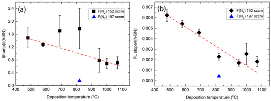 Luminescence hump maximum intensity and h-BN intensity ratio (a) and photoluminescence background line slope ratio with the h-BN peak intensity (b). Blue point refers to the h-BN film deposited using 197 sccm nitrogen gas flow.