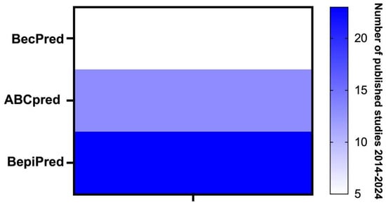 Most frequently employed in silico tools in the past decade for the selection of novel diagnostic molecules for leishmaniasis. Legend: This figure presents the distribution of published studies from 2014 to 2024, classified according to three B-cell epitope prediction tools: BecPred, ABCpred, and BepiPred. The color gradient on the right represents the number of studies, ranging from 5 to 20. The results demonstrate that BepiPred has the highest frequency of publications, followed by ABCpred, while BecPred has the lowest number of studies published within the given timeframe. Note: References for the works included and cited in the figure are provided in the Supplementary Materials.