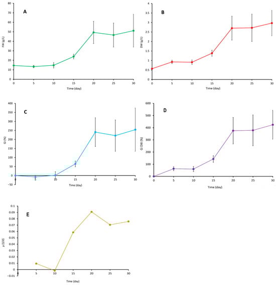 The fresh weight (A), dry weight (B), growth index (C), DW growth index (D) and specific growth rate (E) profiles of the Schisandra henryi cell suspension cultures grown in the stirred tank bioreactor for 30 days. The values are the means of 4 repetitions +/− SD. The growth indices were calculate using this formula, Gi = [(FWx − FW0)/FW0] × 100%, where FWx is the amount of fresh weight harvested on day X, and FW0 is the fresh weight of the inoculum. The DW growth indices were used to calculate using this formula, Gi DW = [(DWx − DW0)/DW0] × 100%, where DWx is the amount of dry weight harvested on day X, and DW0 is the dry weight of the inoculum. The specific growth rate was calculated using this formula, μ = ln(X/X0)/Δt, where μ is the specific growth rate (1/d), X0 and X are the initial and final biomasses (g/L), and Δt is the culture time interval (d).