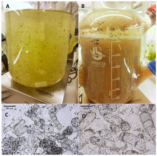 The suspension cell cultures of S. henryi grown in the stirred tank bioreactor: (A) general view, 5 day-old culture; (B) general view, 30-day-old culture; (C) microscope view, 100× magnification; (D) microscope view, 200× magnification.