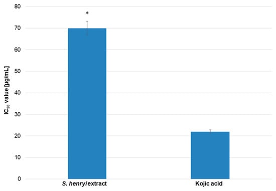 The S. henryi extracts from the suspension cultures grown in a bioreactor inhibited tyrosinase activity. The results (IC50 value [µg/mL]) are shown as the mean values with standard deviations (±SDs) obtained from three independent experiments with three repetitions (n = 9). Standard deviations are marked with error bars. A significant difference relative to kojic acid is marked with an asterisk “*” (p < 0.05).