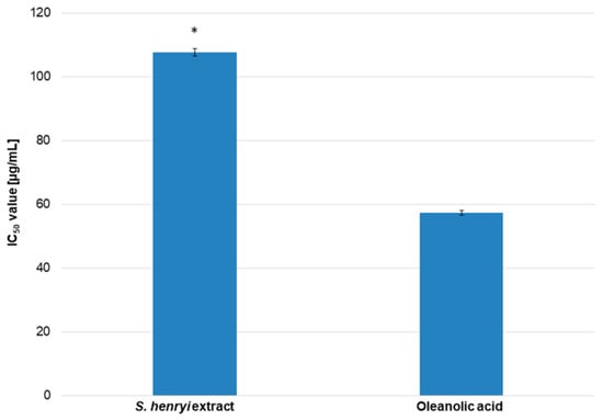 The effect of the S. henryi extracts from the suspension cultures grown in a bioreactor on hyaluronidase activity (expressed as IC50 value [µg/mL]). The results are presented as the mean values with standard deviations (±SDs) obtained from three experiments conducted independently with three repetitions (n = 9). The error bars indicate SDs. A significant difference relative to oleanolic acid is marked with an asterisk “*” (p < 0.05).