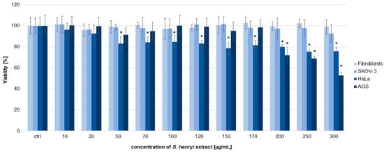 The viability of the cancer AGS, HeLa, and SKOV-3 cells and the non-cancer fibroblasts after 24 h of treatment with the S. henryi extracts from suspension cultures grown in a bioreactor. The control (ctrl) was the cells with DMSO (0.75% (v/v)). Two independent experiments were conducted, with six repetitions (n = 12) of the MTT assay. The results are shown as the mean values with standard deviations (±SDs, error bars). Significant differences relative to the control are marked with an asterisk “*” (p < 0.05).